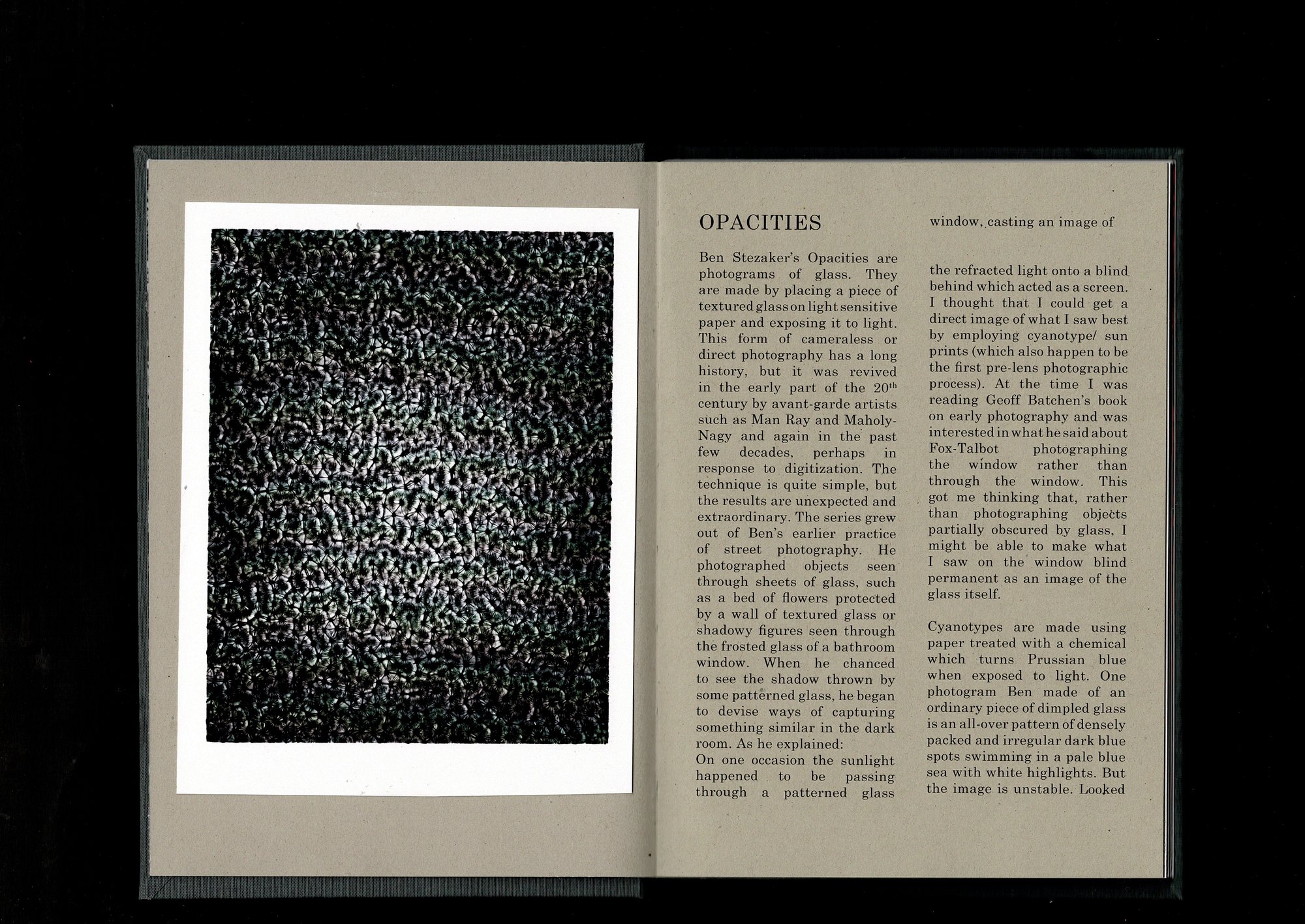 The ‘Opacities’ are darkroom photo grams of what is often called obscured glass, the kind of glass one finds in private parts of domestic homes. The sheets of glass act as compound lenses, fracturing and refracting light to specific focal points directly onto light sensitive paper. These photo grams or contact prints reveal, as one would expect, something of the hidden structure of glass and its peculiarity as neither a liquid nor a solid. But what couldn’t be anticipated was the strange, uncanny space created in this hybrid world of geometric, crystal structure and fluid, organic form. In the process of making the photo grams a single millimetre movement of the glass from the photographic paper can dissolve crystal formations into visceral, organic shapes. The series celebrates an intimate and indexical connection between these two most dominant media of transparency in our culture – glass and photography. - Ben Stezaker.