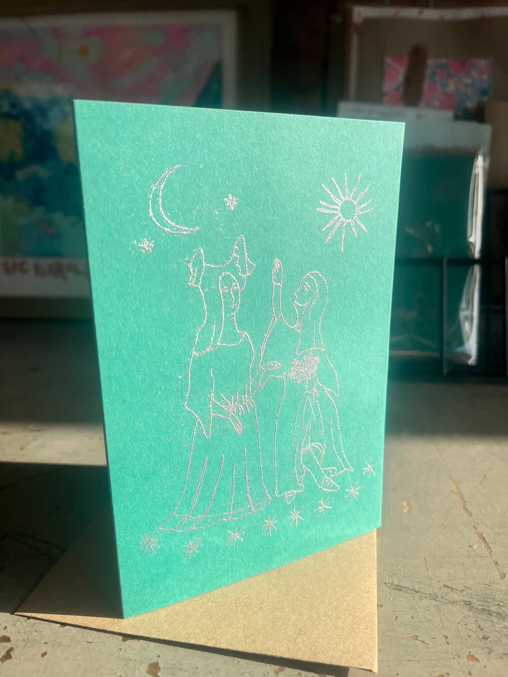 Pack of 3 festive cards and envelopes designed by Annie Mackin. Thermographed silver illustration on 250gsm colour plan paper 11cm by 15cm and gummed craft paper envelopes C6.