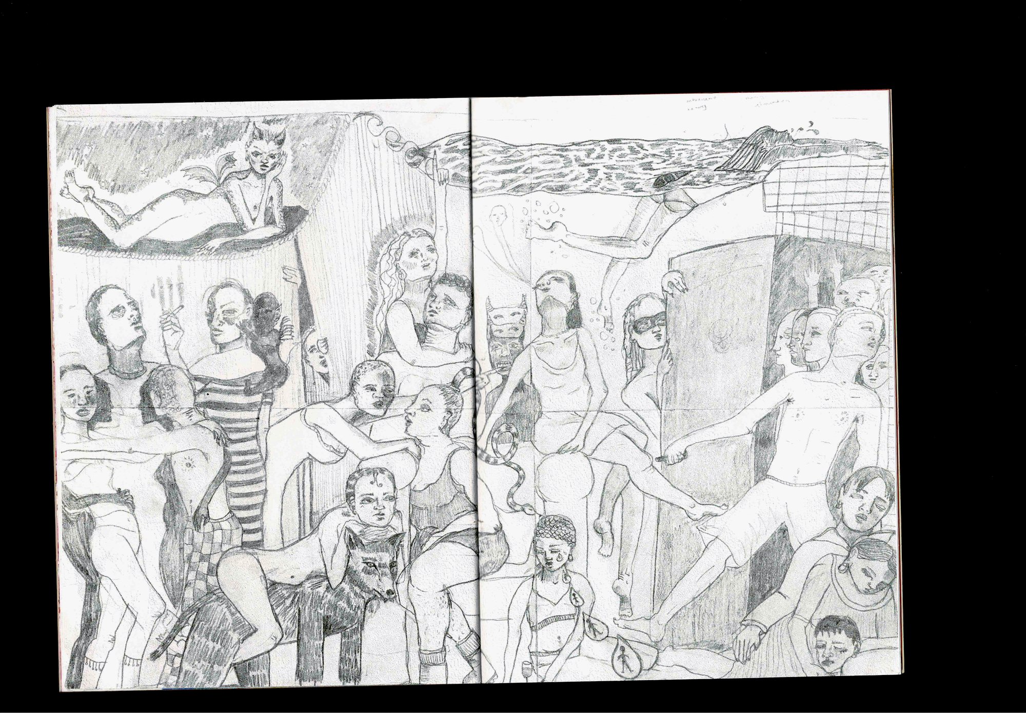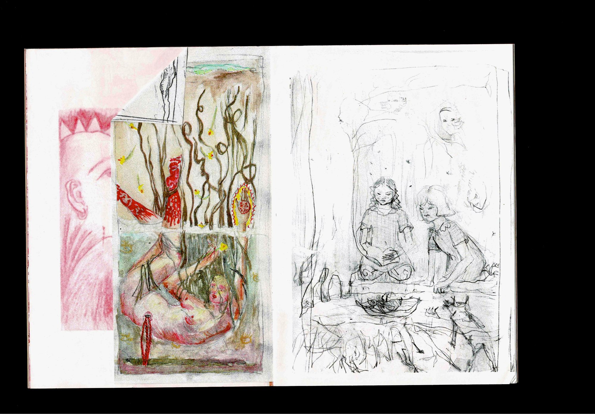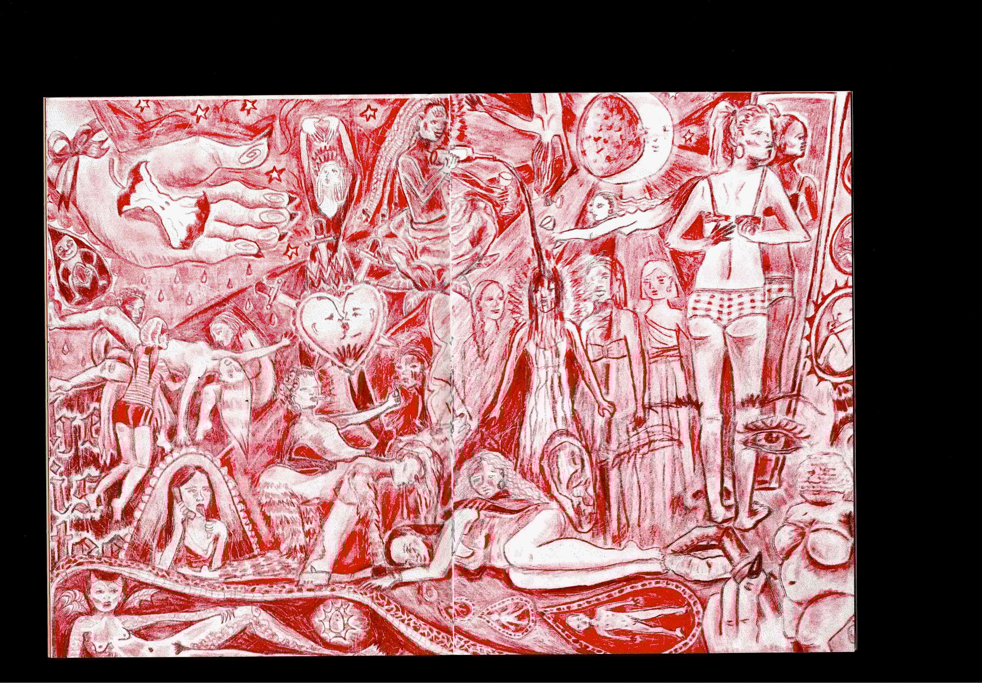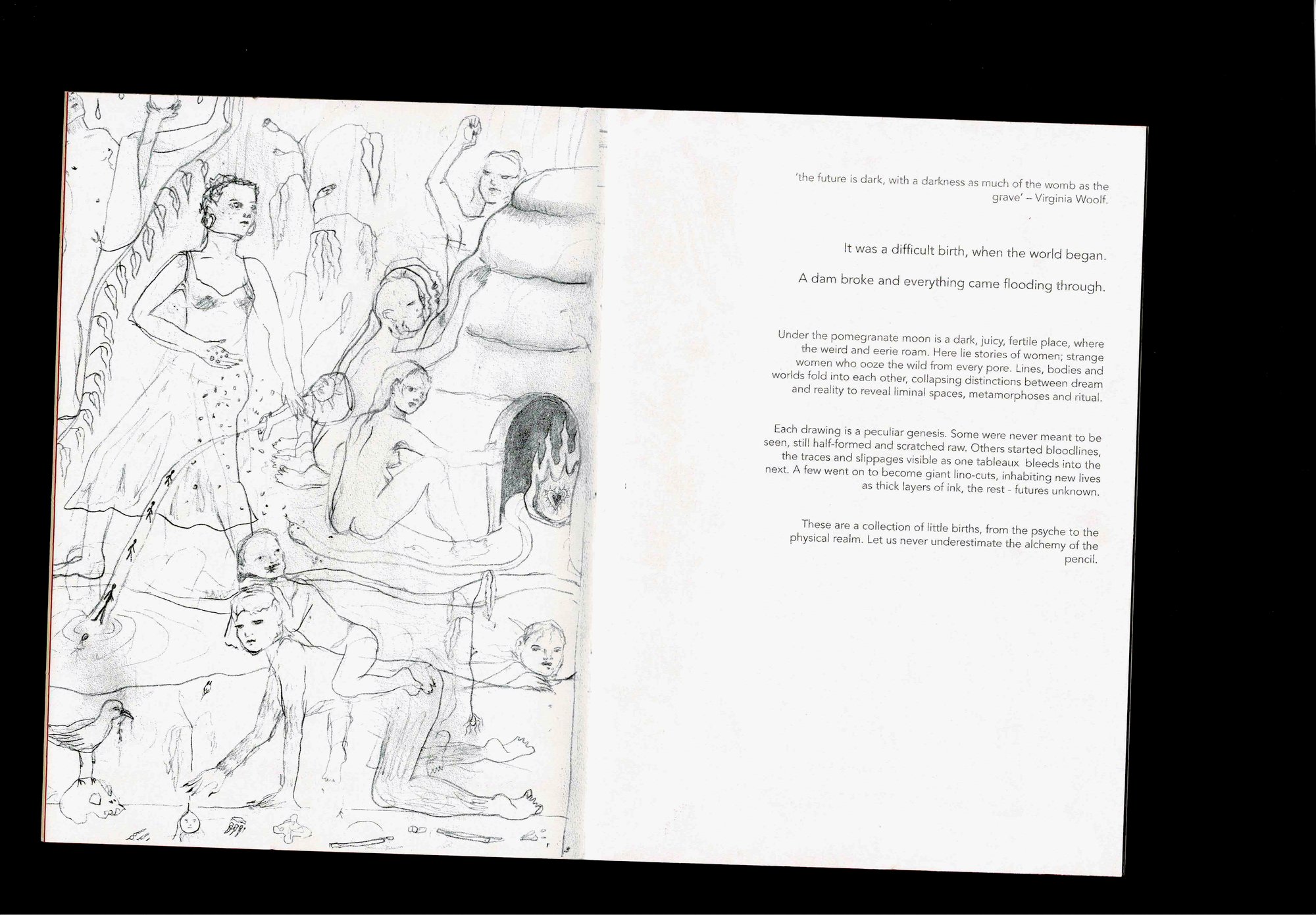 Under the pomegranate moon by Alexi Marshall is a 28 page artist book full of preliminary drawings and tests that are then transformed into her enourmous Lino prints. Made for Alexis solo show at Flatland Projects in 2023